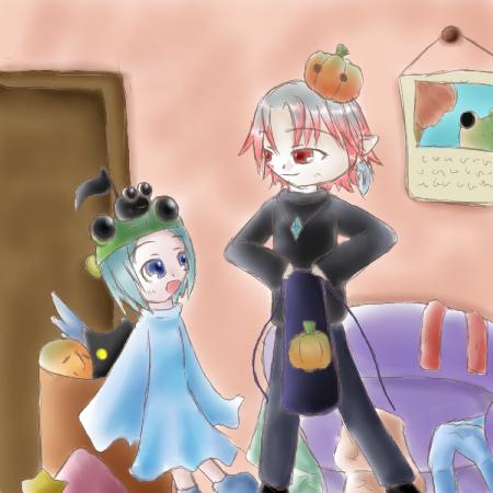 仮題「男ふたり(と一匹)のハロウィン仮装準備」 ポムっち作